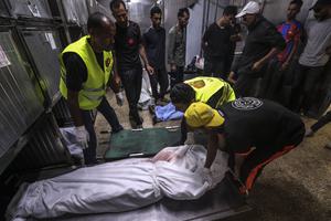 (250624) -- GAZA, 24 junio, 2025 (Xinhua) -- Palestinos se lamentan por las víctimas asesinadas en un sitio de distribución...