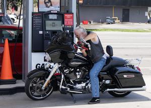 (250624) -- TORONTO, 24 junio, 2025 (Xinhua) -- Un hombre carga combustible en una motocicleta en una estación de servicio,...