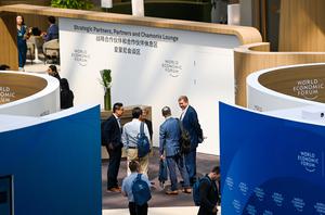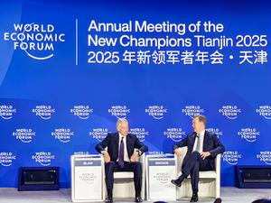 (250624) -- TIANJIN, 24 junio, 2025 (Xinhua) -- Invitados conversan durante el Foro Davos de Verano 2025, en el Centro...