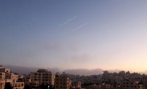 (250624) -- HEBRON, 24 junio, 2025 (Xinhua) -- Rastros de misiles son vistos desde la ciudad de Hebrón, en el...