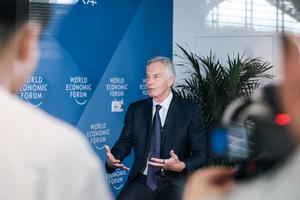 (250624) -- TIANJIN, 24 junio, 2025 (Xinhua) -- El ex primer ministro británico Tony Blair es entrevistado durante el Foro...