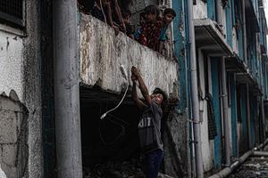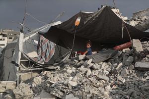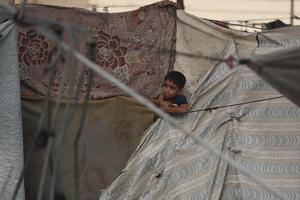 (250624) -- GAZA, 24 junio, 2025 (Xinhua) -- Imagen del 23 de junio de 2025 de un niño palestino desplazado...