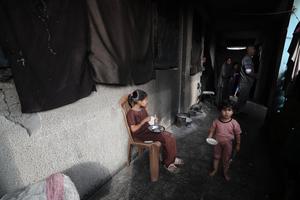 (250624) -- GAZA, 24 junio, 2025 (Xinhua) -- Imagen del 23 de junio de 2025 de una niña palestina desplazada...
