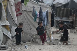 (250624) -- GAZA, 24 junio, 2025 (Xinhua) -- Imagen del 23 de junio de 2025 de niños palestinos desplazados vistos...