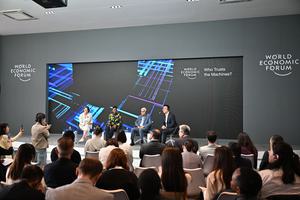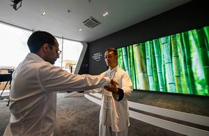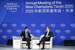 (250625) -- TIANJIN, 25 junio, 2025 (Xinhua) -- Participantes se comunican durante el Davos de Verano 2025 en el Centro...