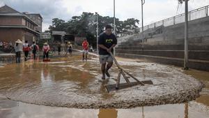 (250626) -- LIUZHOU, 26 junio, 2025 (Xinhua) -- Aldeanos limpian limo, en la aldea de Liangkou del distrito autónomo dong...