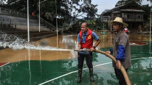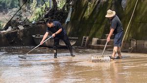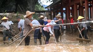 (250626) -- LIUZHOU, 26 junio, 2025 (Xinhua) -- Un aldeano y un voluntario limpian limo, en la aldea de Liangkou...