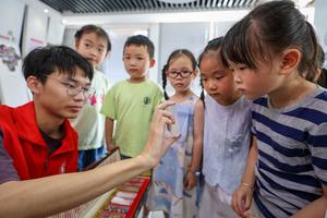 (250626) -- BEIJING, 26 junio, 2025 (Xinhua) -- Un voluntario presenta conocimiento antidrogas a niños en una comunidad, en el...