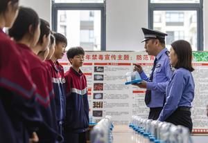 (250626) -- BEIJING, 26 junio, 2025 (Xinhua) -- Un oficial de policía presenta conocimiento antidrogas a estudiantes en una escuela,...