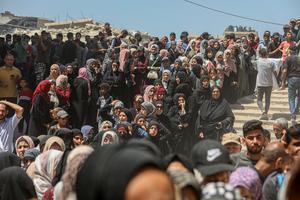 (250626) -- GAZA, 26 junio, 2025 (Xinhua) -- Palestinos se reúnen para recibir ayuda de alimentos en un punto de...