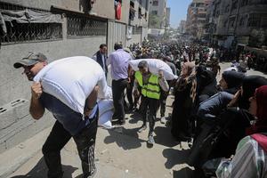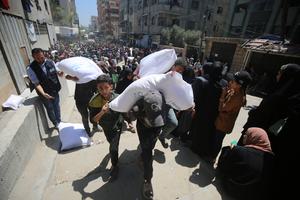 (250626) -- GAZA, 26 junio, 2025 (Xinhua) -- Palestinos se reúnen para recibir ayuda de alimentos en un punto de...
