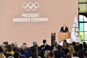 (250623) -- LAUSANA, 23 junio, 2025 (Xinhua) -- El presidente saliente del COI, Thomas Bach, habla durante una ceremonia de...