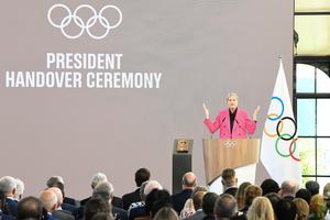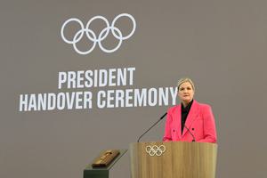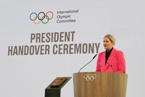 (250623) -- LAUSANA, 23 junio, 2025 (Xinhua) -- La presidenta del COI, Kirsty Coventry, habla durante una ceremonia de entrega...