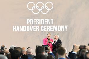 (250623) -- LAUSANA, 23 junio, 2025 (Xinhua) -- El presidente saliente del COI, Thomas Bach (i), reacciona después de ser...