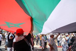 (250623) -- RABAT, 23 junio, 2025 (Xinhua) -- Imagen del 22 de junio de 2025 de personas sosteniendo banderas de...