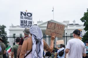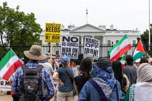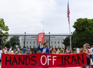 (250623) -- WASHINGTON, 23 junio, 2025 (Xinhua) -- Imagen del 22 de junio de 2025 de manifestantes protestando frente a...