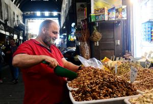 (250605) -- DAMASCO, 5 junio, 2025 (Xinhua) -- Un vendedor sirve nueces para un cliente en su puesto en un...