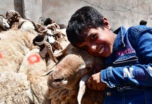 (250605) -- DAMASCO, 5 junio, 2025 (Xinhua) -- Un niño posa con ovejas en un mercado de ganado previo al...