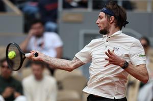 (250605) -- PARIS, 5 junio, 2025 (Xinhua) -- Imagen del 4 de junio de 2025 de Alexander Bublik devolviendo la...