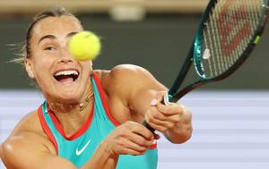 (250605) -- PARIS, 5 junio, 2025 (Xinhua) -- Aryna Sabalenka devuelve la pelota durante la semifinal de individuales femeninos entre...