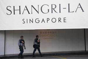 (250530) -- SINGAPUR, 30 mayo, 2025 (Xinhua) -- Personas en uniforme realizan trabajos de seguridad afuera del Hotel Shangri-La, la...