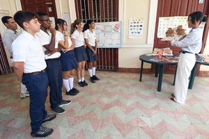 (250529) -- LA HABANA, 29 mayo, 2025 (Xinhua) -- La profesora china, Hou Jiaqi (c), de 28 años, imparte una...