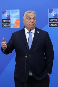 (250625) -- LA HAYA, 25 junio, 2025 (Xinhua) -- El primer ministro húngaro, Viktor Orban, habla con los medios de...