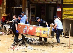(250625) -- QIANDONGNAN, 25 junio, 2025 (Xinhua) -- Personas limpian el limo en la carretera, en el distrito de Congjiang,...