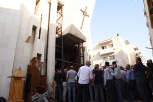 (250623) -- DAMASCO, 23 junio, 2025 (Xinhua) -- Personas asisten a una ceremonia conmemorativa en la iglesia Mar Elias, en...