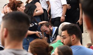 (250623) -- DAMASCO, 23 junio, 2025 (Xinhua) -- Un hombre es consolado durante una ceremonia conmemorativa en la iglesia Mar...