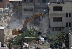 (250623) -- TULKARM, 23 junio, 2025 (Xinhua) -- Una excavadora israelí demuele una casa palestina en el campamento de refugiados...