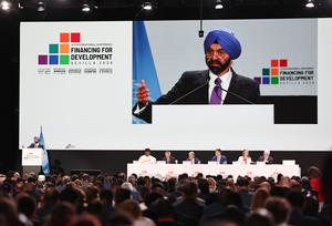 (250630) -- SEVILLA, 30 junio, 2025 (Xinhua) -- El presidente del Grupo del Banco Mundial, Ajay Banga, habla durante la...
