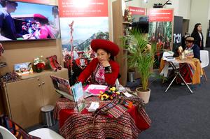 (250628) -- LIMA, 28 junio, 2025 (Xinhua) -- Una expositora espera por visitantes en un estand durante el evento Perú...