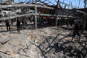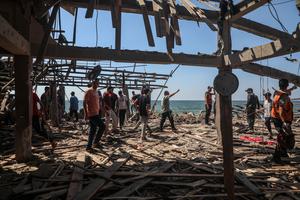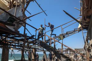 (250630) -- GAZA, 30 junio, 2025 (Xinhua) -- Personas se reúnen en una cafetería frente al mar destruida en un...