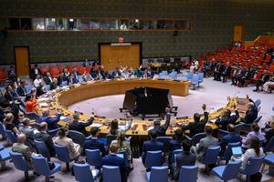 (250630) -- NACIONES UNIDAS, 30 junio, 2025 (Xinhua) -- Representantes votan en un proyecto de resolución durante una reunión del...