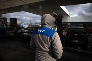 (250630) -- BUENOS AIRES, 30 junio, 2025 (Xinhua) -- Un empleado de la petrolera argentina Yacimientos Petrolíferos Fiscales (YPF) espera...