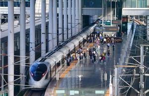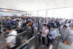 (250701) -- BEIJING, 1 julio, 2025 (Xinhua) -- Pasajeros se registran en la Estación del Ferrocarril de Huzhou, en la...