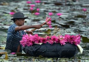 (250701) -- COLOMBO, 1 julio, 2025 (Xinhua) -- Un hombre recolecta lirios de agua rosados de un lago, en Hokandara,...