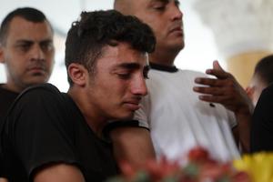(250701) -- HEBRON, 1 julio, 2025 (Xinhua) -- Palestinos se lamentan durante el funeral del adolescente palestino Amjad Abu Awad,...