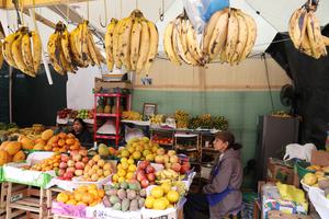 (250702) -- LIMA, 2 julio, 2025 (Xinhua) -- Vendedoras esperan por clientes en un puesto de frutas de un mercado,...