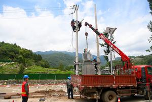 (250702) -- ZHENGZHOU, 2 julio, 2025 (Xinhua) -- Trabajadores reparan cables eléctricos, en el poblado de Taiping del distrito de...