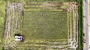 (250702) -- QINZHOU, 2 julio, 2025 (Xinhua) -- Vista aérea del 2 de julio de 2025 de una cosechadora recolectando...