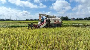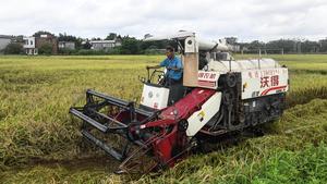 (250702) -- QINZHOU, 2 julio, 2025 (Xinhua) -- Un agricultor conduce una cosechadora para recolectar arroz, en la aldea de...
