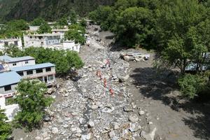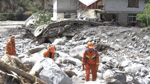 (250706) -- CHENGDU, 6 julio, 2025 (Xinhua) -- Imagen del 5 de julio de 2025 de rescatistas buscando sobrevivientes en...