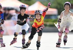 (250705) -- BEIJING, 5 julio, 2025 (Xinhua) -- Niñas participan en una competencia de patinaje sobre ruedas, en la ciudad...