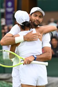 (250705) -- LONDRES, 5 julio, 2025 (Xinhua) -- Zhang Shuai/Marcelo Arévalo (atrás) se abrazan al término del partido de primera...