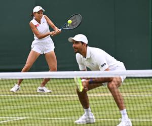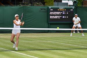 (250705) -- LONDRES, 5 julio, 2025 (Xinhua) -- Zhang Shuai (i)/Marcelo Arévalo compiten durante el partido de primera ronda de...