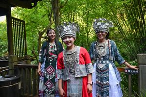 (250705) -- CHONGQING, 5 julio, 2025 (Xinhua) -- Turistas portan atuendos tradicionales mientras visitan el punto escénico de Taohuayuan, en...