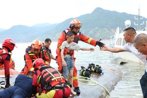(250705) -- CHENZHOU, 5 julio, 2025 (Xinhua) -- Rescatistas trabajan en el sitio del hundimiento de un barco, en la...