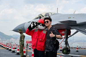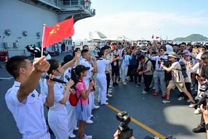 (250705) -- HONG KONG, 5 julio, 2025 (Xinhua) -- Un visitante posa para fotografías en el portaaviones Shandong, en Hong...
